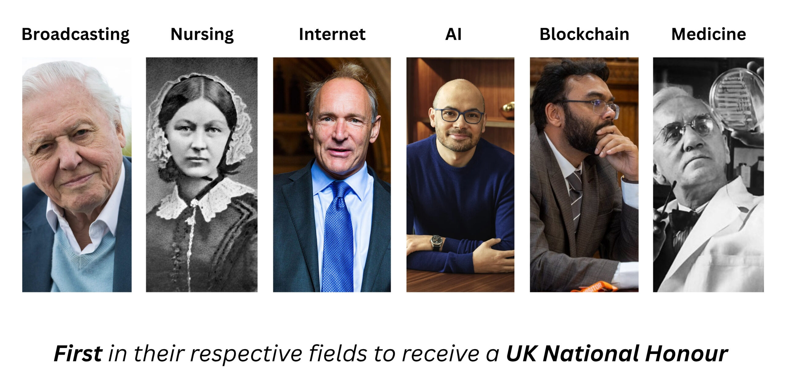 First Person in the world to be awarded the UK National Honour (MBE) for outstanding services to Blockchain and Cryptoasset Technologies